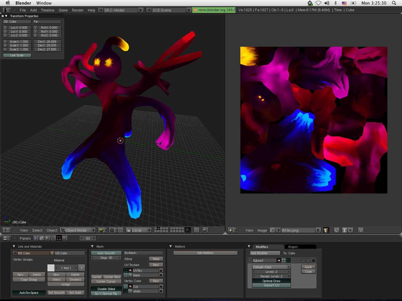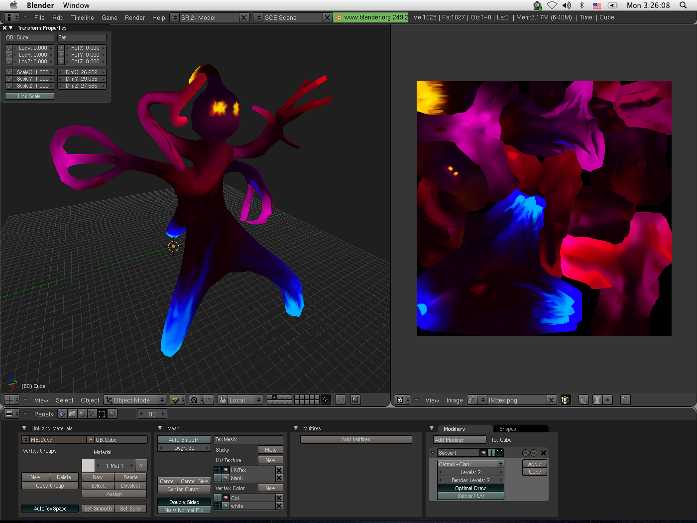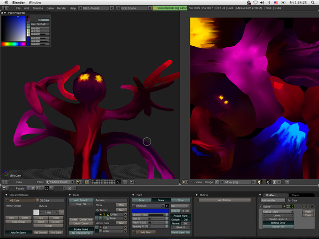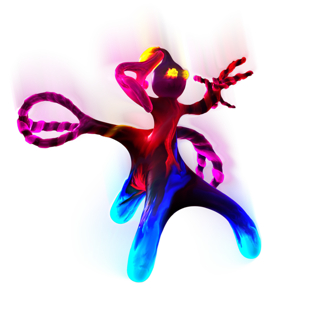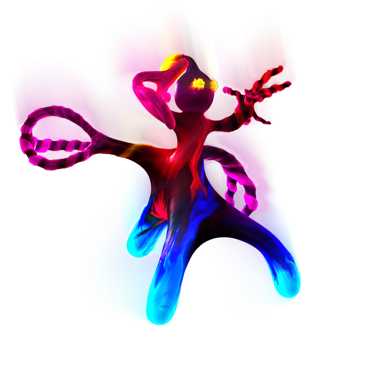 When I started, there was no original concept for this model. I just sat down and started improvising the modeling and texturing for this creature, with no goal other than simply to create something. I would imagine that when I started, I had started from the head down, as I see nowhere else on the body that resembles a "drop". I suppose that I had really been happy with the way that my "Eyeguy" had come out, and I decided to try and paint another creature in the same style. Over time, I guess I forgot how to paint like that. When I picked up the model to finish it's paint job in 2010, I was unable to replicate the same style of painting, so I started painting spiral color streaks on him instead.