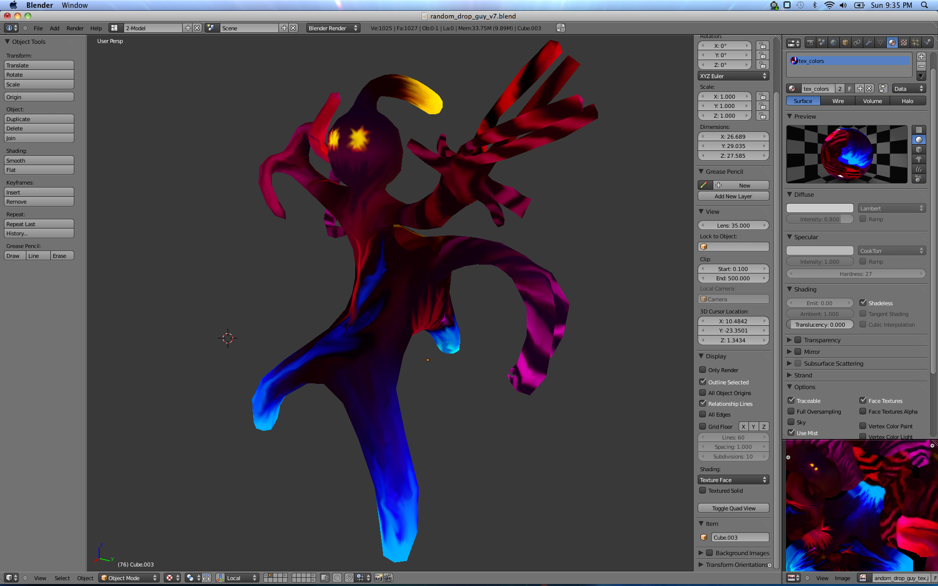 You can see the interactive 3D version of the "Random Drop Guy" on my 3D models page. Below are some of the screenshots that I took while working on this model... though seriously, the modeling was the easiest part. The painting took the longest for sure. Hopefully with more practice, I'll get faster at the painting part.