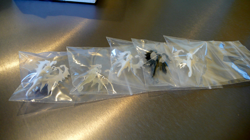 The First Toy Photos from 2009 that I should have taken the time to post earlier: Chantell's Dragon. These photos were originally taken on July 20th, 2009. Holy crap, that was a long time ago. Anyway, this was actually the -very first- model that I ever had 3D printed at Shapeways, and the Version 0 model(which these photos are of) lacked a bit of feature definition, as it was my very first 3D print, and . the Version 1 revision of the model(of which I currently have no photos) significantly increased the quality of a number visible details, such as the wing's interior details, the socket of the Eye, and the distinction of the beak from the rest of the face. I sell these on my Shapeways store for around $5.50, if you select one of the Plastic materials. The model is also offered in several Metal materials. I have yet to see any of those in person, but I have seen a few pictures online where other people have had the model printed in Stainless Steel, Silver, and even Gold. While the detailed pictures below are mostly of the "White Strong & Flexible" material, one of the members of the Shapeways Forum was kind enough to take a large picture of the model printed in the Transparent Plastic material as well.